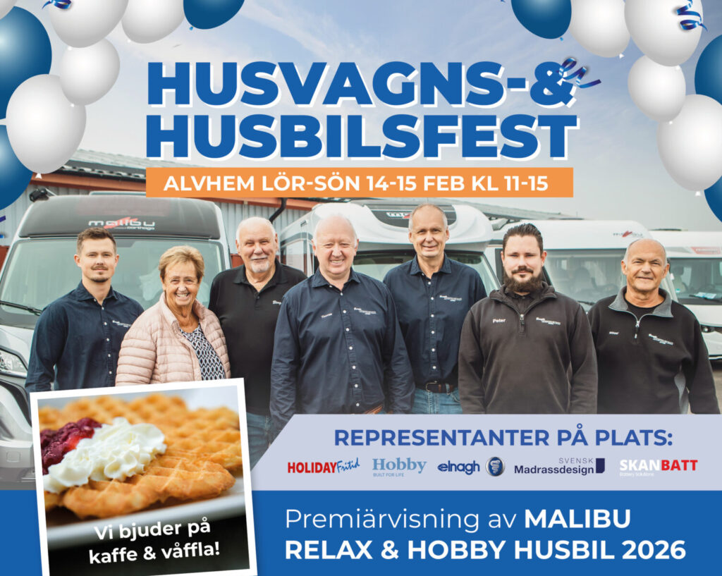 Vi bjuder in alla besökare att fira med oss med nygräddade våfflor och aromatiskt kaffe. Du kan också upptäcka exklusiva öppningsrabatter på husbilar från årsmodell 2025, vanar från årsmodell 2026 och attraktiva erbjudanden/offerter på vår campingutrustning. Kom och starta den nya säsongen med oss!